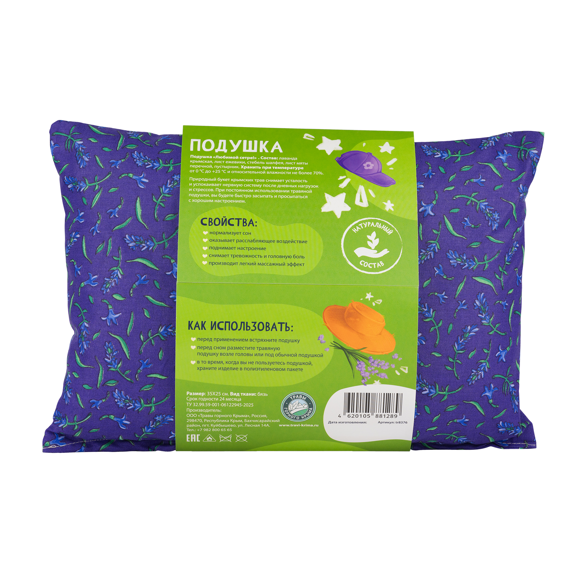 Природный букет крымских трав снимает усталость и успокаивает нервную систему после дневных нагрузок и стрессов. При постоянном использовании травяной подушки, вы будете быстро засыпать и просыпаться с хорошим настроением.