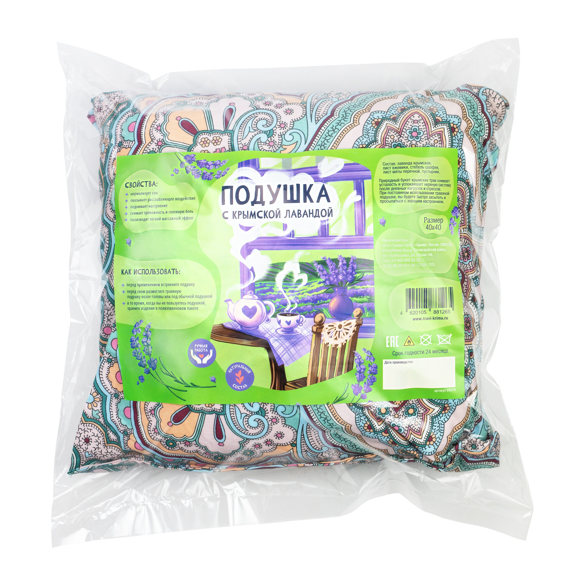 Подушка с крымской лавандой - эффектный и полезный подарок близкому человеку, родственнику или другу. Такой предмет интерьера будет поднимать настроение каждый день, а аромат крымских трав и цветов будет успокаивать. Чехол подушечки изготовлен из бязи и наполнен полезными арома травками из Крыма. Размер 40х40 см. Маленькая подушка заключена в яркую обечайку с авторским дизайном.