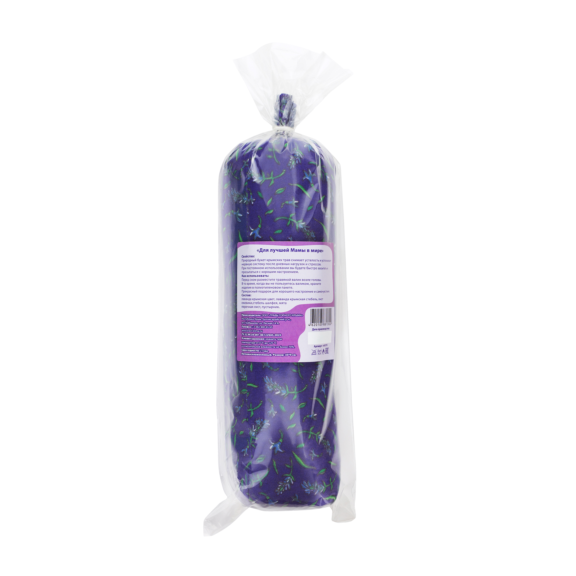 Валик - подушка цилиндрической формы. Травяная подушка наполнена целебными травами, которые помогут вам спокойно спать и просыпаться с хорошим настроением. Валик довольно больших размеров, поэтому он сможет долго дарить вам свой приятный аромат.